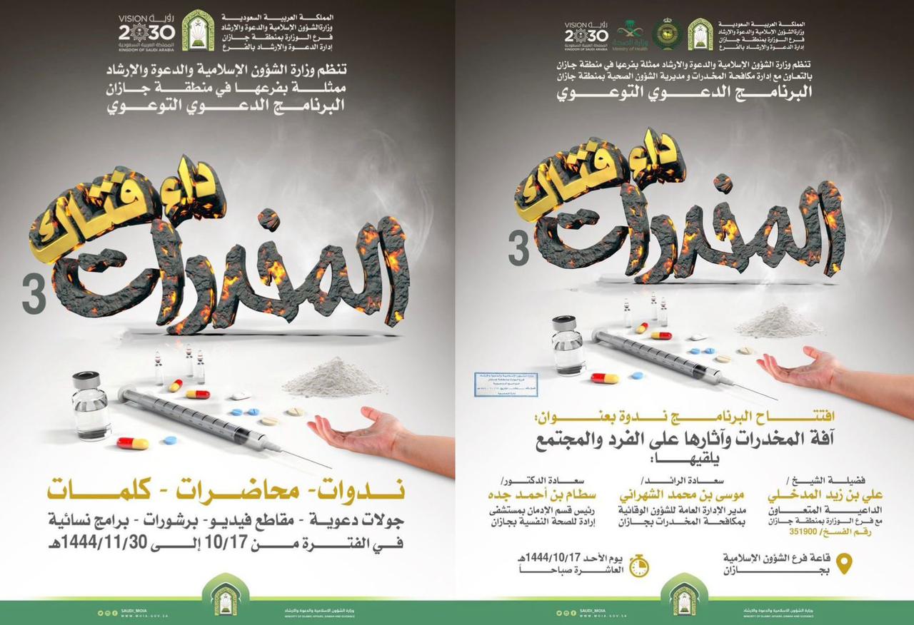 يقيم فرع وزارة الشؤون الإسلامية والدعوة والإرشاد في منطقة جازان وبالتعاون مع المديرية العامة لمكافحة المخدرات وفرع الصحة البرنامج الدعوي التوعوي ( المخدرات داء فتاك ) في نسختها الثالثة والتي سيدشن صباح الأحد السابع عشر من شهر شوال ١٤٤٤ هجرية بندوة علمية توعوية يقدمها فضيلة الشيخ علي بن زيد مدخلي الداعية المتعاون بالفرع وبمشاركة سعادة مدير الإدارة العامة للشؤون الوقائية بمكافحة المخدرات الرائد موسى بن محمد الشهراني وسعادة رئيس قسم الإدمان بمستشفى إرادة للصحة النفسية الدكتور سطام بن أحمد جده يبينون خلال الندوة ( آفة المخدرات وأثرها على الفرد والمجتمع ) والتي ستقام في القاعة الرئيسة بالفرع تمام العاشرة صباحاً بحضور سعادة مدير عام مكافحة المخدرات اللواء سعد بن محمد جليغم.
