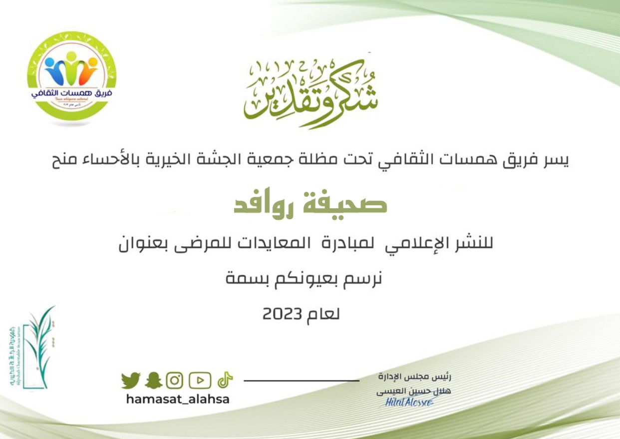 تواصل الإعلامية فتحية عبد الله مندوبة الصحيفة بالمنطقة الشرقية حصد العديد من شهادات التقدير للصحيفة ؛ نظير جهودها المتميزة ونشاطها الملموس في تغطية جميع الفعاليات بالمنطقة، وقد تلقت شهادة شكر وتقدير من فريق همسات الثقافي والذي يعمل تحت مظلة جمعية الجشة الخيرية بالأحساء للنشر الإعلامي لمبادرة المعايدات للمرضي بعنوان ” نرسم بعيونكم بسمة”.