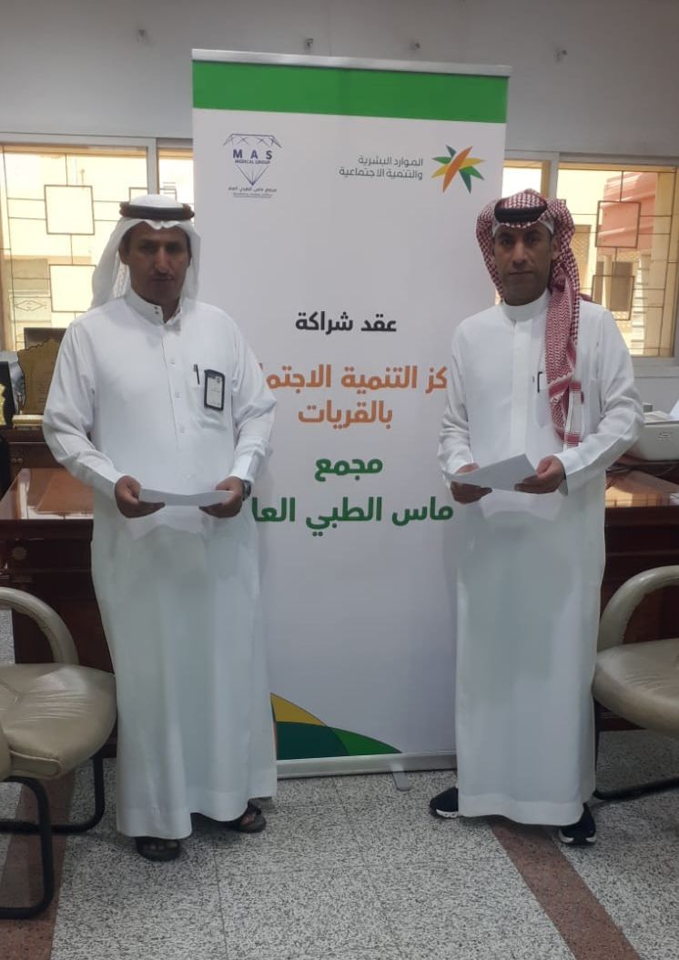 وقع مركز التنمية الاجتماعية بمحافظة القريات ممثلا بمدير المركز الأستاذ / سالم بن محمد الشراري عقد شراكة مع مجمع ماس الطبي ممثلا بالمدير الإداري الأستاذ/ محمد قاسم الشامي.