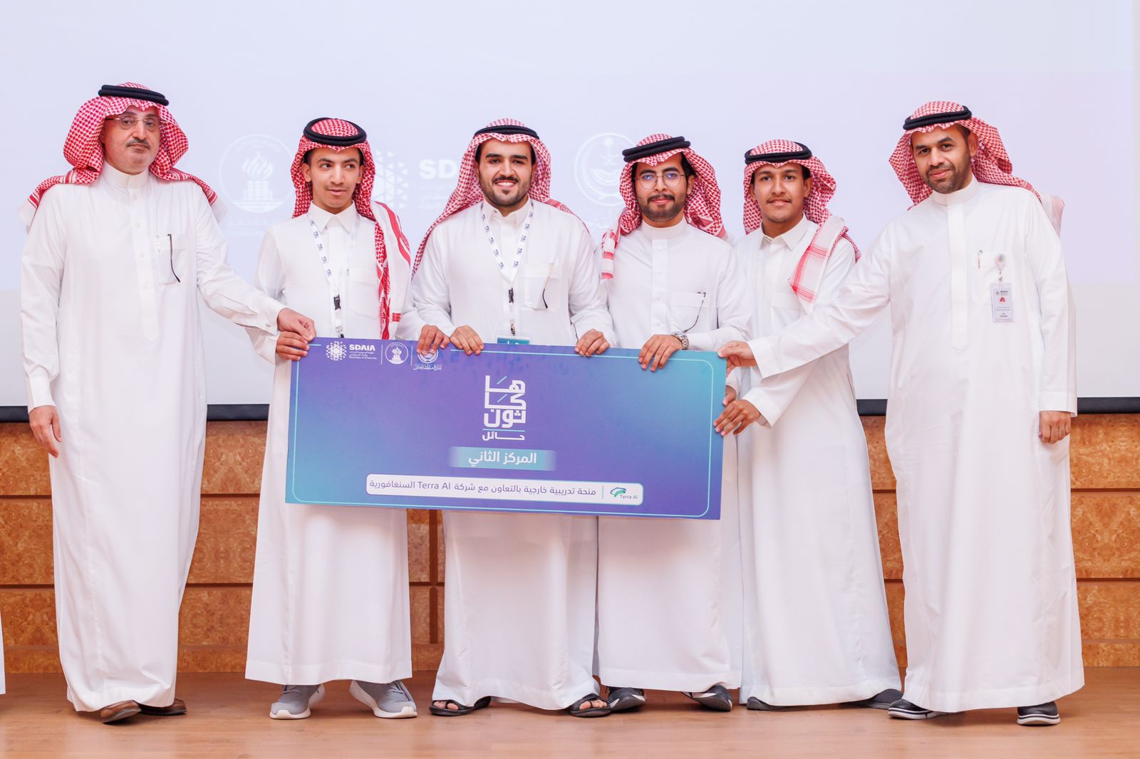 وجرى اليوم تتويج 3 أفكار إبداعية في الحفل الختامي للتحدي بحضور لجنة تحكيم استثنائية تتضمن أعضاء من سدايا وجامعة حائل، حيث حصد المركز الأول فريق (Global Geeks ) بفكرة قائمة على استخدام الذكاء الاصطناعي في فرز النفايات وتصنيفها وجمع البيانات عنها، ثم تحليل هذه البيانات، وقد استحقوا من خلال هذه الفكرة منحة تدريبية خارجية بالتعاون مع شركة IBM واشتراك سنة في منصة Coursera للتدريب، كما حصد فريق (TTF) على المركز الثاني بفكرة قائمة على بناء نظام ذكي و متكامل يعتمد على الذكاء الاصطناعي لمراقبة الأماكن العامة عن طريق كاميرات وحساسات لفهم وتحليل مخالفات الذوق العام الصوتية والمرئية ورصدها تلقائيًا للجهات المختصة، والتي خولتهم للحصول على منحة تدريبية خارجية بالتعاون مع شركة Terra AI السنغافورية، فيما حصد فريق (منذر) على المركز الثالث بفكرة تستخدم فيها خوارزميات التعلم العميق الجمعي في إنشاء أنظمة إنذار مبكر للسيول المطرية، وإنشاء أنظمة تخطيط المدن الذكية المستقبلية، والتي خولتهم للحصول على منحة تدريبية في معسكر علوم البيانات في سدايا.