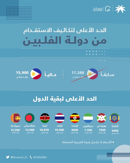 أعلنت وزارة الموارد البشرية والتنمية الاجتماعية عن خفض السقف الأعلى لتكاليف الاستقدام من الفلبين. وأوضحت الوزارة أن التسعيرة الجديدة أصبحت 15.900 ريال بدلا من السعر السابق 17.288 ريالا غير شامل قيمة الضريبة المضافة.