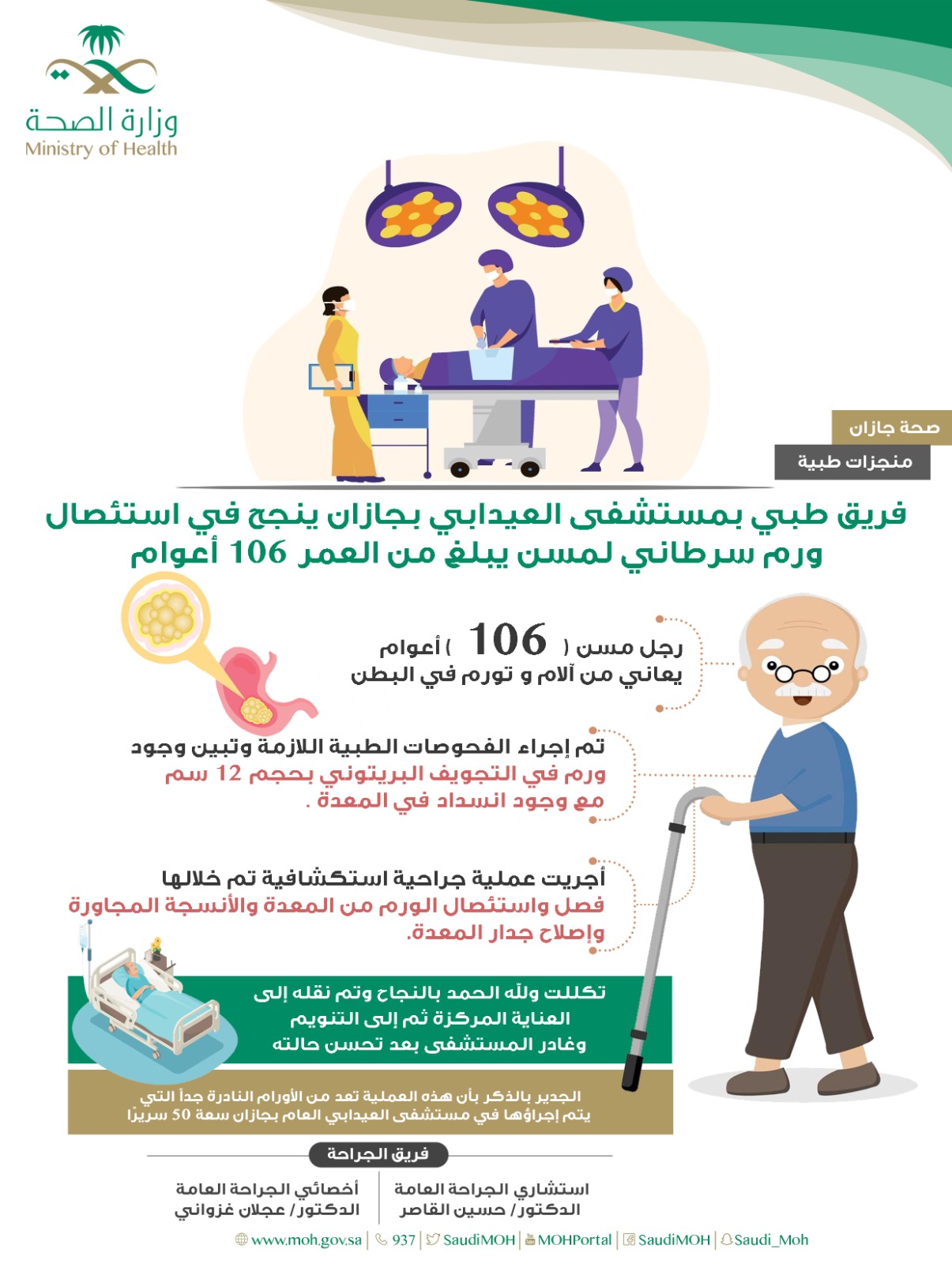 تمكن فريق الجراحة العامة بمستشفى العيدابي العام من استئصال ورم سرطاني من معدة مسن يبلغ من العمر 106 أعوام تكللت بالنجاح ولله الحمد .