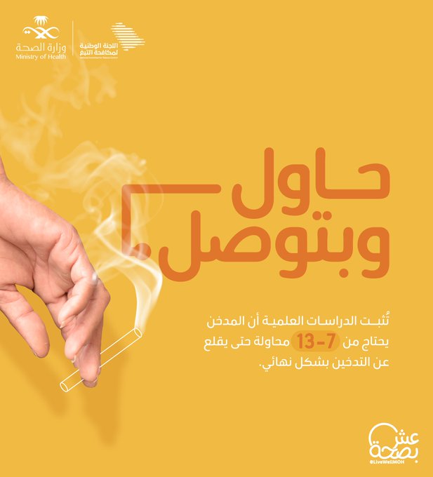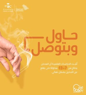 أطلقت وزارة الصحة عبر حسابات “عش بصحة”- المنصة الرئيسة للتوعية في الوزارة- مبادرة جديدة تحث المدخنين على الإقلاع عن التدخين، تحت وسم #حاول_وبتوصل.