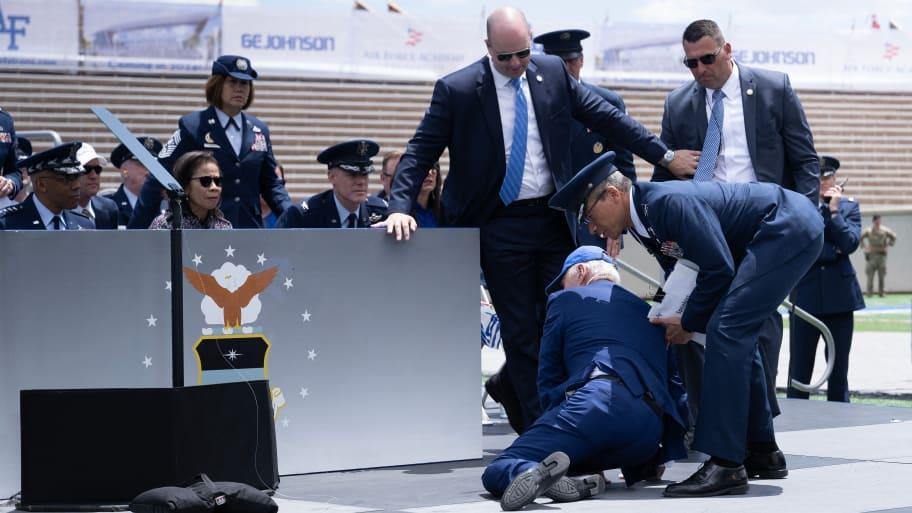 وتسبب تعثر بايدن بكيس رمل على المنصة، في سقوطه على ركبتيه حيث بادر أحد مسؤولي الأكاديمية بمساعدته على النهوض مرة أخرى.