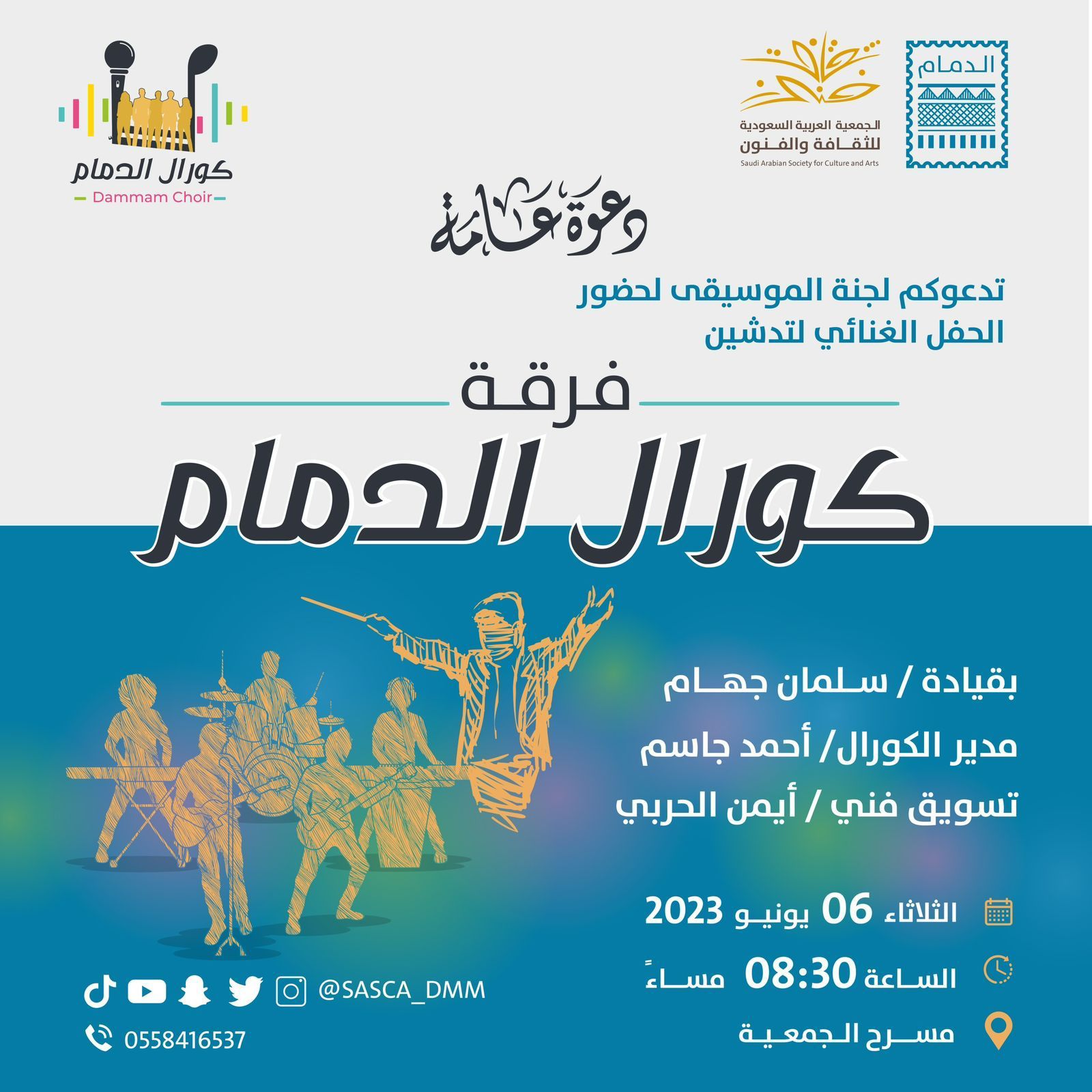 أطلقت جمعية الثقافة والفنون بالدمام اليوم على مسرح الجمعية الحفل الغنائي لتدشين فرقة كورال الدمام بقيادة المايسترو سلمان جهام ، وتتضمن مجموعة من الأعمال الغنائية. وتعتبر فرقة كورال الدمام تجديد لحلم أول كورال أطلقته الجمعية في عام 1985م لتحمل على عاتقها تقديم العروض الغنائية الجماعية، تماهياً مع رؤية 2030 التي أطلقتها قيادتنا الرشيدة. يُذكر أن مشروع فرقة كورال الدمام تم العمل عليه منذ 16 أغسطس 2022م برعاية جمعية الثقافة والفنون بالدمام وتم تدريب المجموعة على الأداء الصوتي بأساليب علمية موسيقية ، وأقيمت لهم دورة تدريبية مكثفة في الصولفيج والفوكاليز تحت اشراف موسيقيين متخصصين وهم الأساتذة أمنية أبو جمال وأمين شحادة وخالد إبراهيم تحت إدارة مدير الكورال الإعلامي والصحفي والمصور الفوتوغرافي الأستاذ أحمد جاسم وقام الأستاذ أيمن الحربي بالتسويق الفني وتصميم شعار الكورال.