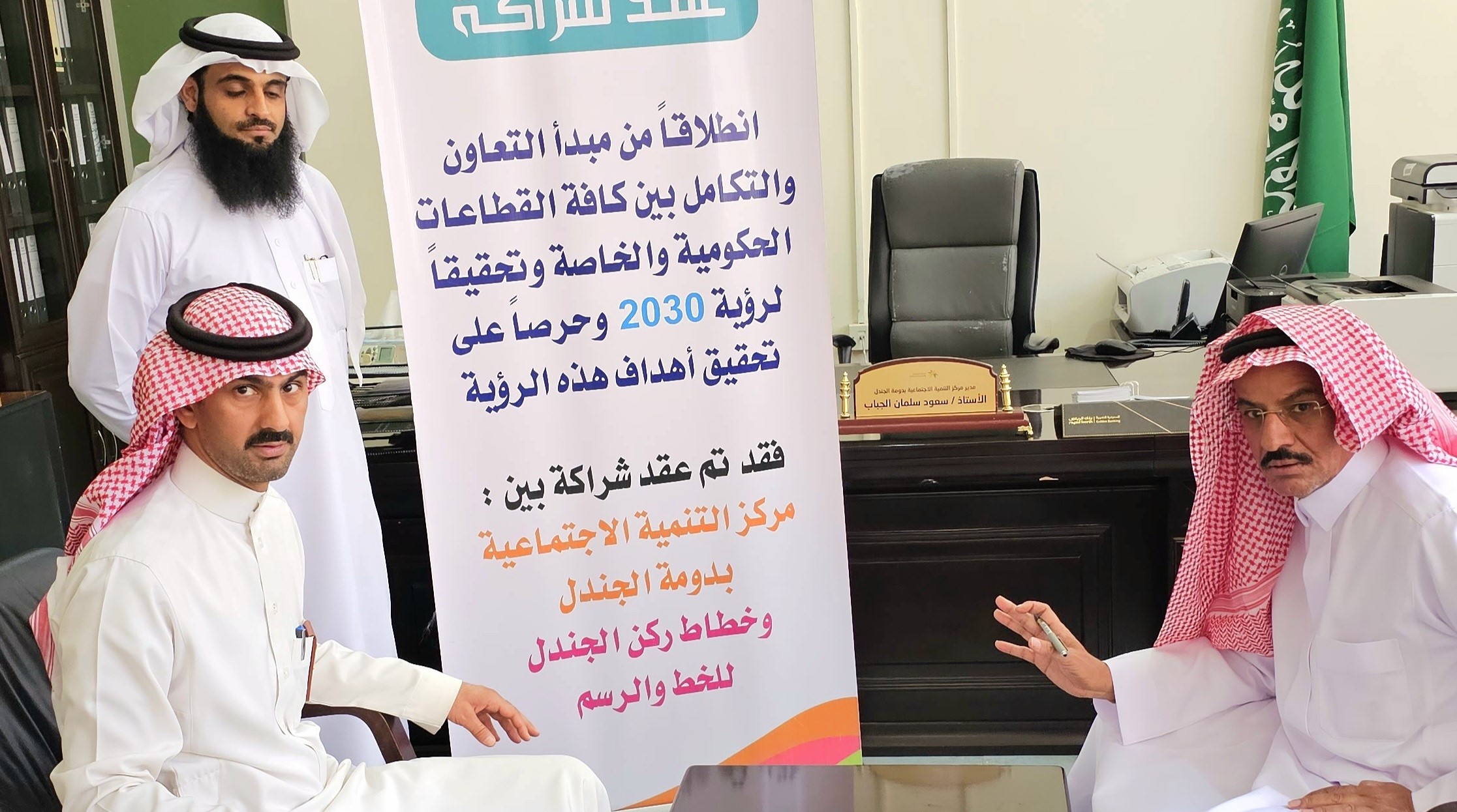 وقع مركز التنمية الاجتماعية بمحافظة دومة الجندل عقد شراكة مجتمعية مع خطاط ركن الجندل للخط والرسم وتم التوقيع من قبل مدير المركز الأستاذ / سعود سلمان الجباب ومثل مالك الخطاط الأستاذ/ محمد زايد العمير.