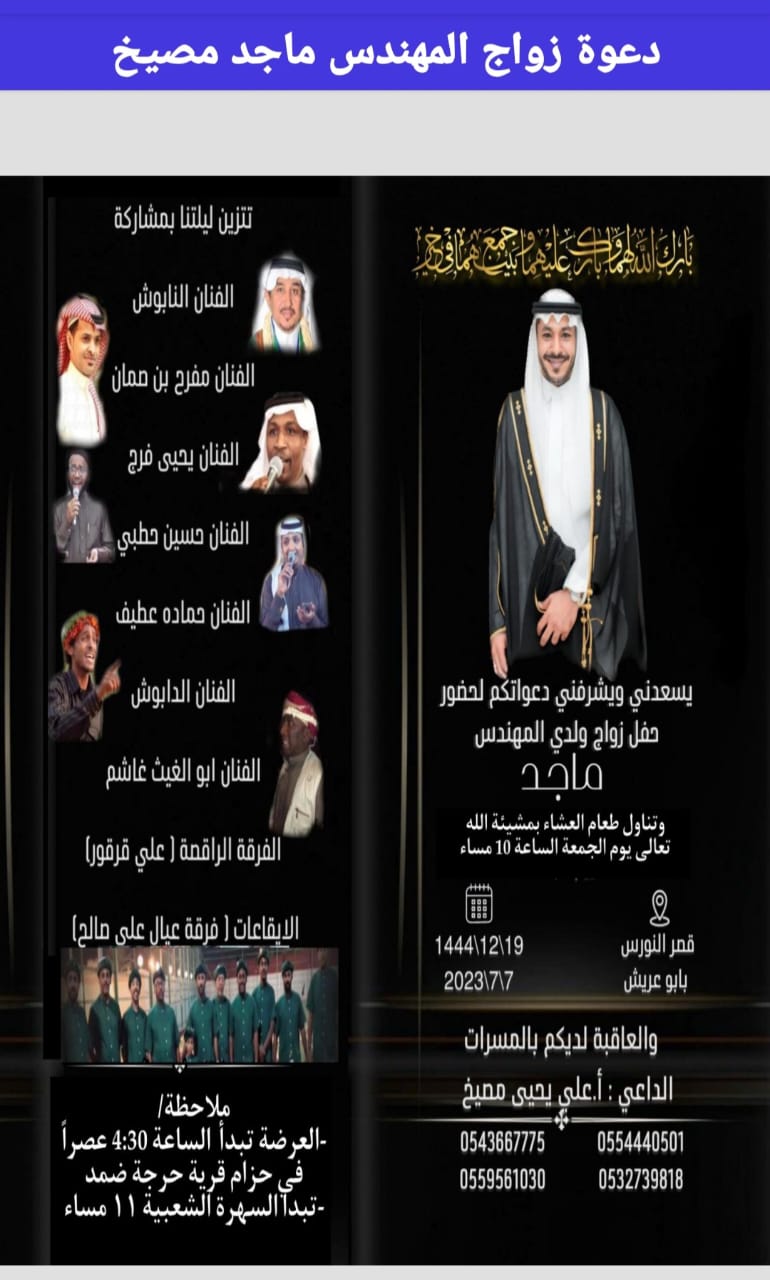 وجه على يحيى مصيخ الدعوة لحضور زواج ابنه المهندس ماجد ، وتناول طعام العشاء، وذلك يوم الجمعة المقبل بقصر النورس بأبو عريش ، وسوف يقام حفل كبير بهذه المناسبة السعيدة يحييه مجموعة كبيرة من الفنانين وهم : الفنان النابوش، والفنان مفرح بن صمان، والفنان يحيى فرج، والفنان حسين حطبي، والفنان حسين عطيف، والفنان الدابوش، والفنان أبو الغيث غاشم ، والفرقة الراقصة ( على قرقور) ،والإيقاعات فرقة عيال على صالح.