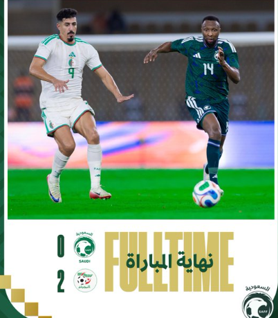 تغلّب المنتخب الجزائري على نظيره المنتخب السعودي بنتيجة هدفين دون مقابل، في اللقاء الودي الذي جمعهما اليوم على ملعب مدينة الأمير عبدالله الفيصل بجدة، ضمن ختام المعسكر الإعدادي للمنتخب السعودي استعدادًا للمشاركة في بطولة كأس العرب FIFA قطر 2025.