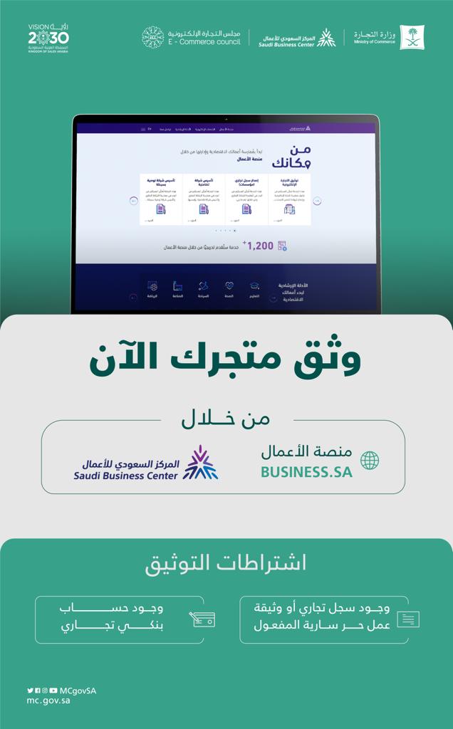 وأوضحت الوزارة أن إجراءات التوثيق سهلة وميسرة وتتم بشكل إلكتروني عبر: https://business.sa ويشترط للحصول على التوثيق: وجود سجل تجاري أو وثيقة عمل حر سارية المفعول، ووجود حساب بنكي تجاري.