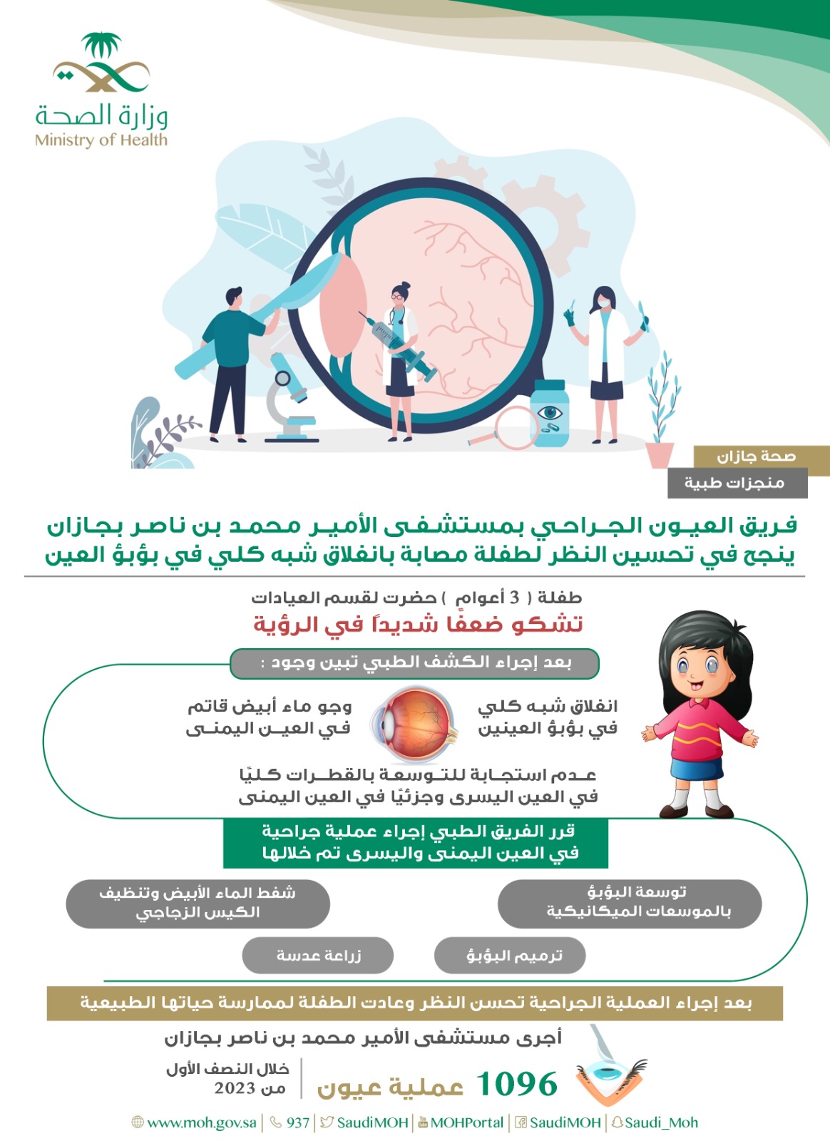 تمكن فريق العيون الجراحي بمستشفى الأمير محمد بن ناصر بجازان من ترميم بؤبؤ العين لطفلة تبلغ من العمر 3 أعوام.