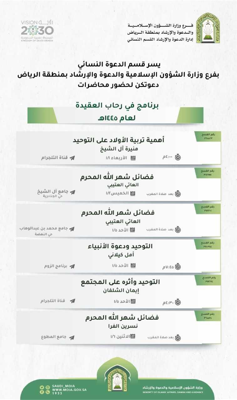 تطلق وزارة الشؤون الإسلامية والدعوة والإرشاد، ممثلة بفرعها في منطقة الرياض، اليوم، برنامجاً دعوياً نسائياً بعنوان: (في رحاب العقيدة) يستمر حتى الخامس عشر من شهر محرم الجاري، يتضمن سلسلة من المحاضرات النسائية تلقيها عدد من الداعيات في جوامع مدينة الرياض وعبر وسائل التواصل الاجتماعي والوسائط الالكترونية.