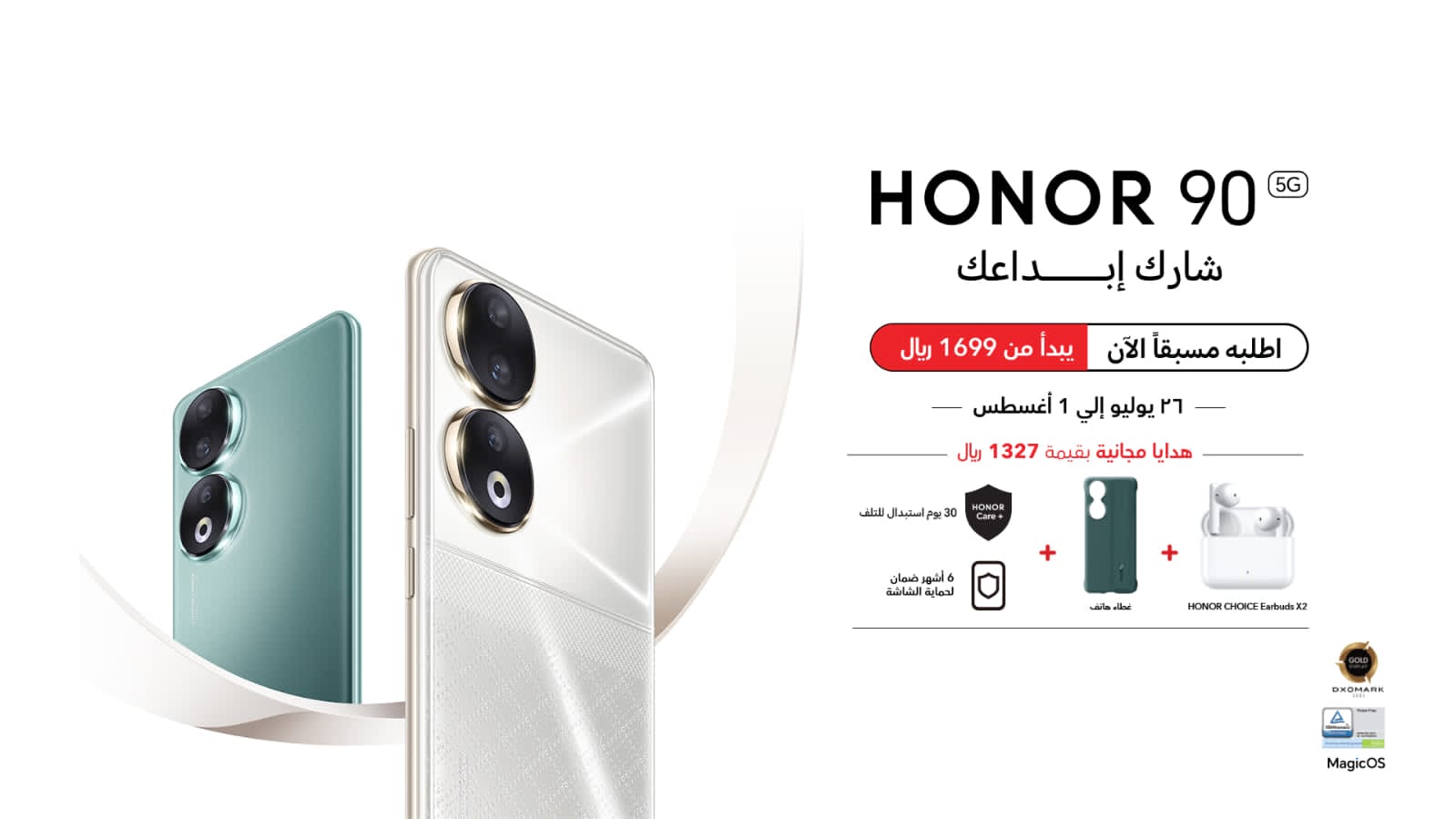 هاتف HONOR 90 5G متوفر الآن للطلب المسبق بسعر يبدأ من 1699 ريال للنسخة سعة (8GB+256GB) وبسعر 2099 سعة (12GB+512GB)مع هدايا بقيمة 1327 ريال تتضمن سماعات، HONOR Care+، وأكثر. يمكن للمستهلكين طلب HONOR 90 مسبقاً من خلال مكتبة جرير، اكسترا، STC، زين، لولو، نون، أمازون ومتاجر البيع الأخرى.