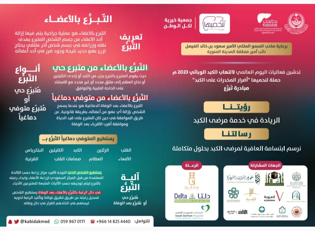 برعاية كريمة من صاحب السمو الملكي الأمير/ سعود بن خالد الفيصل نائب أمير منطقة المدينة المنورة، تدشن الجمعية السعودية الخيرية لمرضى الكبد(كبدك)-فرع منطقة المدينة المنورة، برامج فعاليات اليوم العالمي لالتهاب الكبد الوبائي 2023م، وإطلاق حملة “لنحميها” للتعريف بأضرار المخدرات على الكبد، ومبادرة “تبرع” لحث المجتمع على التبرع بالكبد وذلك بمنطقة المدينة المنورة خلال الفترة من: 27/07/2023م الى: 06/08/2023 م.