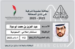 حصل الإعلامي والكاتب القدير المستشار الاعلامي الأستاذ عبدالعزيز بن محمد أبوعباة على عضوية نادي الصحافة التابع لجمعية الفجيرة الثقافية الاجتماعية بدولة الامارات العربية كمستشار إعلامي وبهذه المناسبة نتقدم