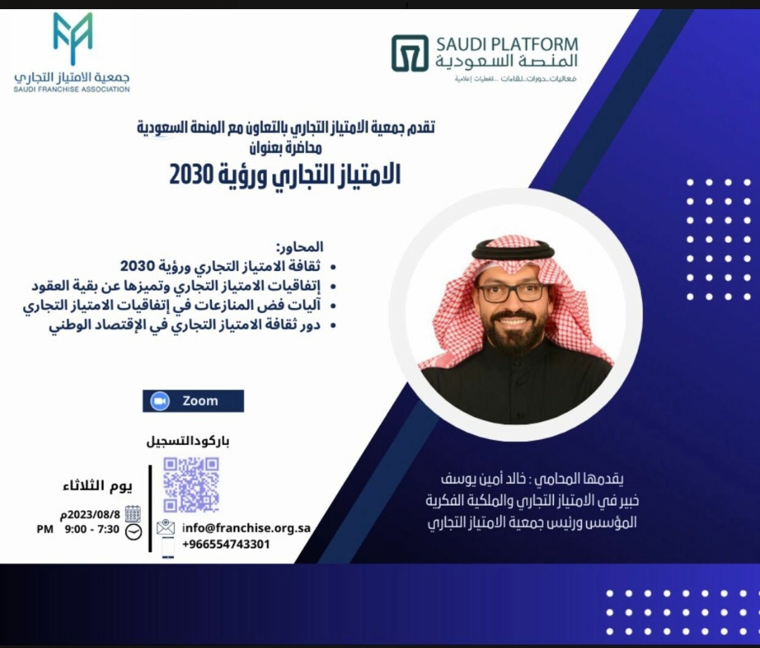 تقدم جمعية الامتياز التجاري بالتعاون مع المنصة السعودية محاضرة مجانيةبعنوان : ( الامتياز التجاري ورؤية 2030 )، وذلك حول ثقافة الامتياز التجاري مع رؤية 2030 للمساهمة في توسيع ثقافة السوق لخلق عدد من الوظائف في مختلف القطاعات ؛ ولنشر ثقافة الامتياز التجاري والتحدث عن أبرز الحقوق والواجبات والمخاطر المتعلقة بفرص الامتياز ، وكذلك وثيقة الإفصاح وأبرز آليات فض المنازعات في اتفاقيات الإمتياز التجاري ، والتي يقدمها المحامي : الأستاذ خالد أمين يوسف خبير في الإمتياز التجاري والملكية الفكرية ومكافحة الغش التجاري المؤسس ورئيس جمعية الامتياز التجاري ، والتي سيكون موعدها يوم الثلاثاء المقبل الموافق 8/ 08 /2023 م ، من الساعة 7:30 – 9:00 مساءً عن بعد عبر منصة ( زووم ).