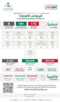 وأبانت أنه تم تسجيل 161 حالة تعافٍ جديدة، ليصل إجمالي عدد المتعافين إلى 356848 حالة، لافتة إلى أن هناك 1922 حالة نشطة حالياً، من بينها 317 حالة حرجة.