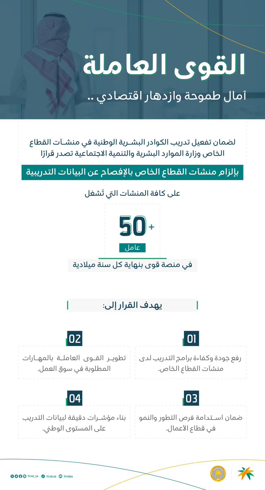 ويهدف القرار إلى رفع جودة وكفاءة برامج التدريب لدى منشآت القطاع الخاص للمساهمة في تعزيز قدرات وكفاءة العاملين لديها واستدامة فرص التطور والنمو, حيث تسعى الوزارة من خلال القرار إلى توفير مؤشرات واضحة لبيانات التدريب على المستوى الوطني وتحسين أداء وإنتاجية القوى العاملة, بالإضافة إلى تحقيق نتائج البرنامج الوطني لتحفيز القطاع الخاص في تدريب العاملين وتزويدهم بالمهارات المطلوبة في سوق العمل.