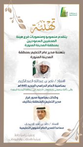 قدم منسوبو ومنسوبات فرع هيئة الصحفيين السعوديين بمنطقة المدينة المنورة التهنئة إلى سعادة مدير عام تعليم منطقة المدينة المنورة الأستاذ ناصر بن عبدالله العبدالكريم بمناسبة العام الدراسي الجديد ١٤٤٥