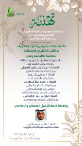 كما قدموا تهنئتهم بمناسبة صدور قرار مدير التعليم بتكليف الأستاذ خالد بن عايد الأحمدي مساعداً للمدير العام للشؤون التعليمية، وتكليف الزميل الصحفي والإعلامي الأستاذ خالد الحربي مديراً للإعلام التربوي، وتكليف عدد من مدراء ومديرات المكاتب في المنطقة.