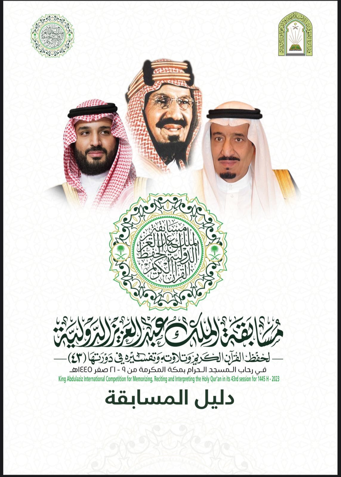 اعتمدت وزارة الشؤون الإسلامية والدعوة والإرشاد، الدليل التنظيمي لمسابقة الملك عبدالعزيز الدولية لحفظ القرآن الكريم وتلاوته وتفسيره، التي تنظمها الوزارة ممثلة بالأمانة العامة للمسابقة المحلية والدولية برعاية كريمة من خادم الحرمين الشريفين ــ أيده الله ــ وتقام في رحاب المسجد الحرام بمكة المكرمة، في دورتها الثالثة والأربعين لهذا العام بمشاركة 166 متسابق من 117 دولة.