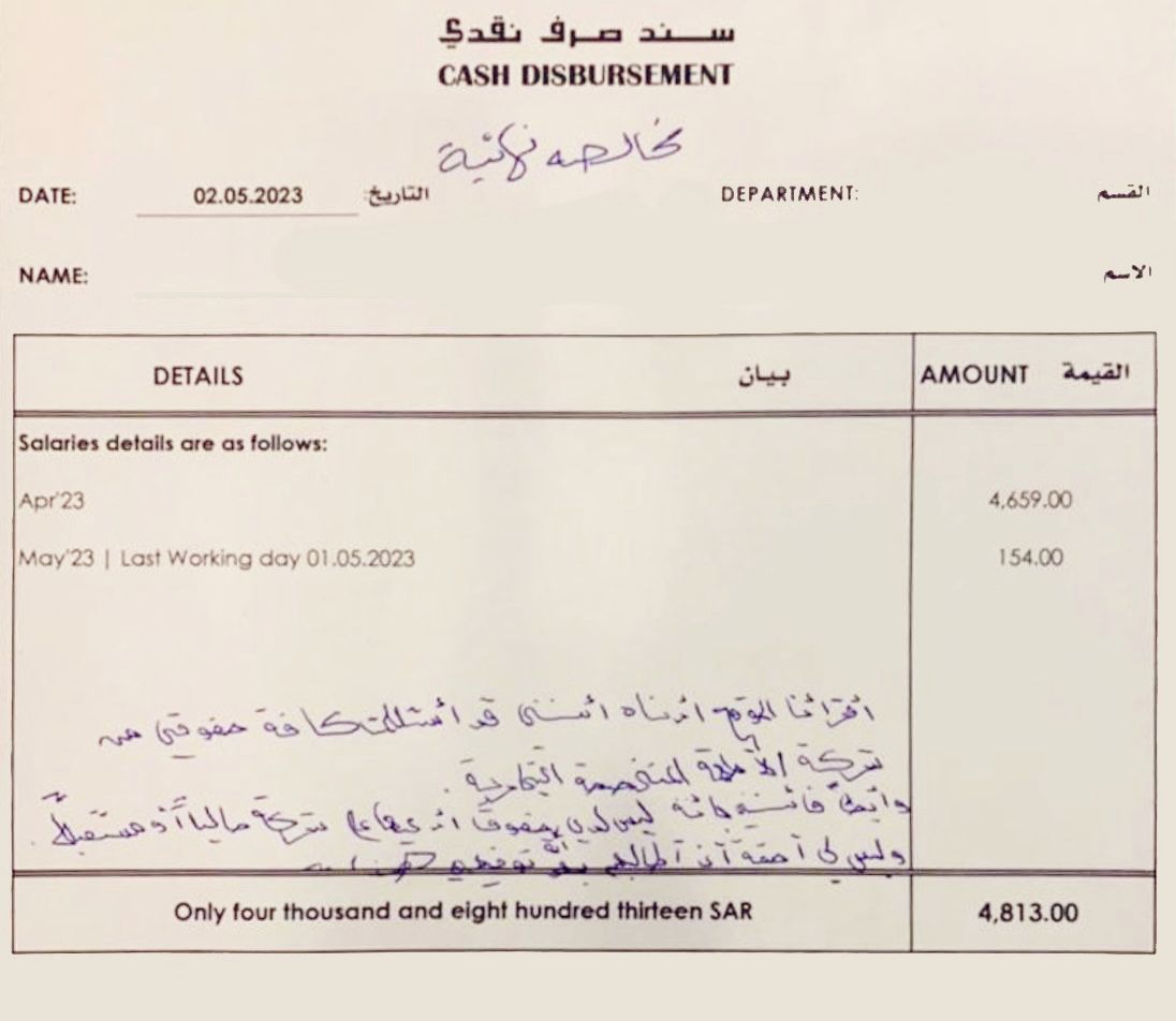 وتضيف قدمت استقالة للمطعم ولم أتقدم بشكوى ضدهم ، ولكن عندما لاحظت أنهم يتعمدون تأخير الراتب ، ويؤخرون خروجها من التأمينات السعودية ، قلت لهم لي راتب لم أستلمه منكم لمدة شهر ، وقد تم إعطائها ورقة مكتوب فيها راتب الشهر ويوجد بداخله بخط كبير شهر راتب وخط صغير جدا عن شهر أخر وهو شهر المماطلة على مبلغ راتب من التأمينات الشهرية للمطعم تعطيه التأمينات السعودية للموظف السعودية لهم لاخر يوم ، تقول أنها لم تنتبه للخط الصغير وقعت على الورقه ، وأعطها عباراة أن لا يوجد لگ حقوق على شركة ، تقول الي تشتكي لي إن العباراة على أساس حقوق راتب شهر يوم كتبت هذا الكلام ثم أخذ الورقة منها صاحب المطعم بسرعة وكتب عليها وتحت عبارة سند القبض مخالصه نهائيه