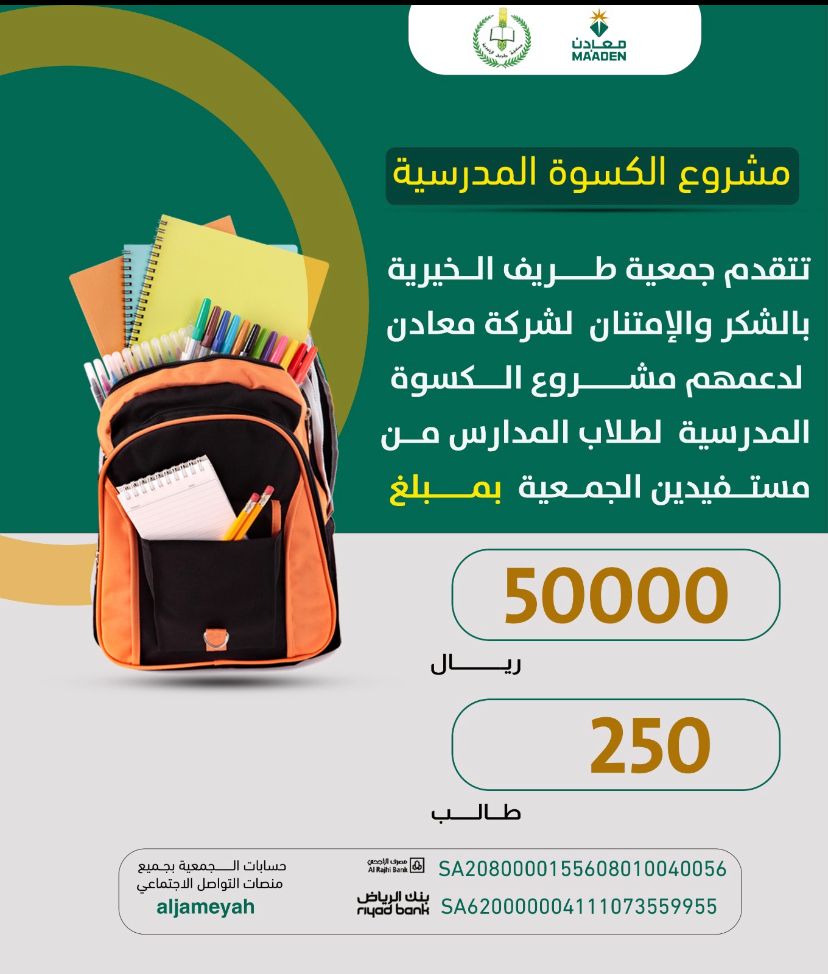 تتقدم جمعية طريف الخيرية بالشكر والإمتنان إلى شركة معادن maadn ؛ لدعمهم مشروع الكسوة المدرسه لطلاب المدارس المستفيدين بجمعية طريف الخيرية بمبلغ ٥٠٠٠٠ ريال لعدد ٢٥٠ طالبا، سائلين الله لهم الأجر والتوفيق على هذا الدعم المبارك.