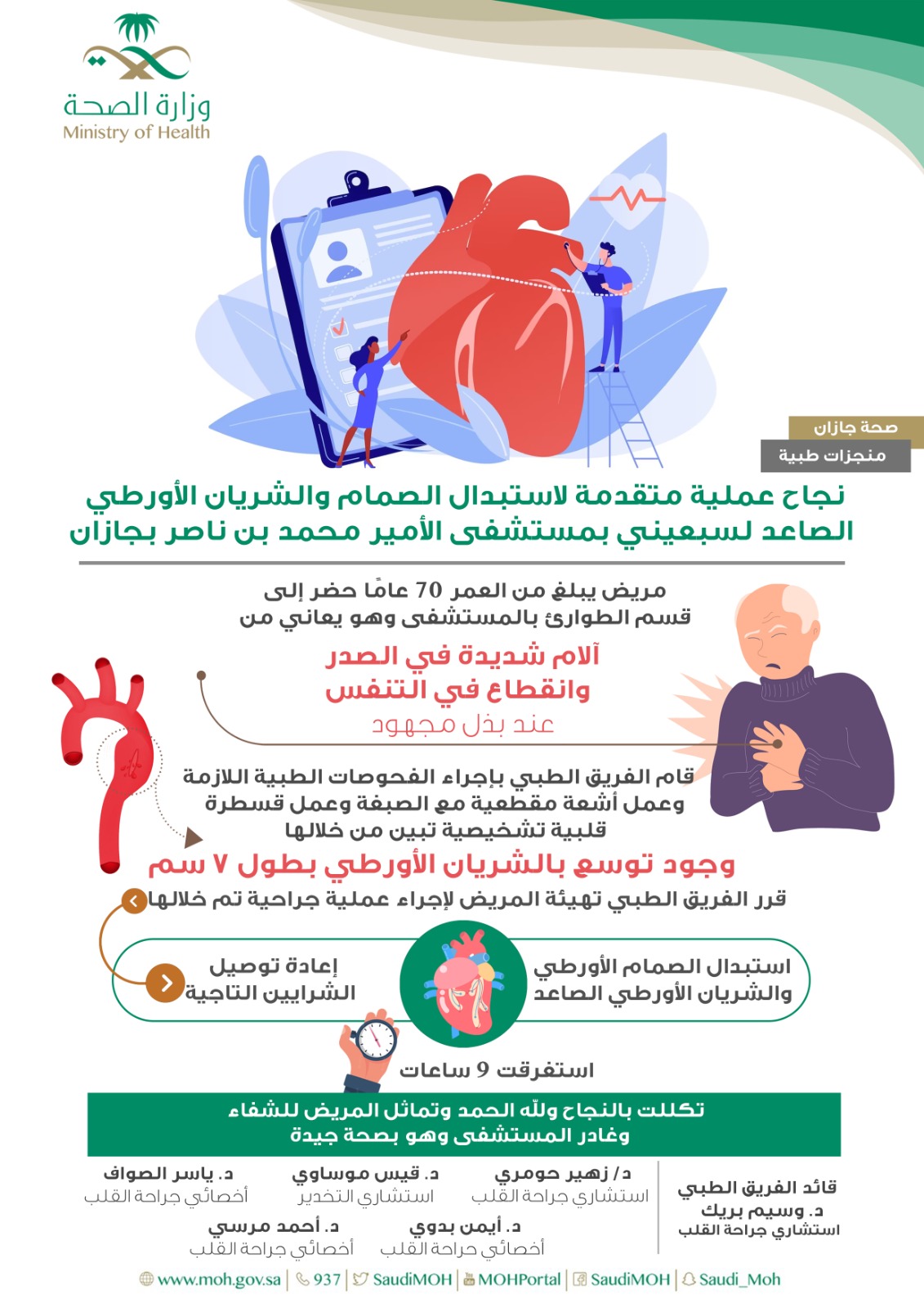 أوضحت صحة جازان بأن فريق جراحة القلب والأوعية الدموية بمستشفى الأمير محمد بن ناصر بجازان تمكن من إجراء عملية استبدال للصمام والشريان الأورطي الصاعد لمريض سبعيني بنجاح .