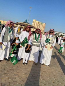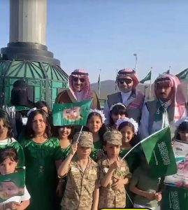 ومشاركة الأهالي فرحتهم بهذا اليوم المجيد للوطن وصفحة مضيئة تضاف إلى سجل حافل بالإنجاز بالأمن والآمان وذكرى لتوحيد السعودية العظمى على يد الملك عبدالعزيز بن عبدالرحمن آل سعود رحمه الله.