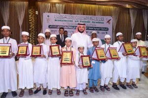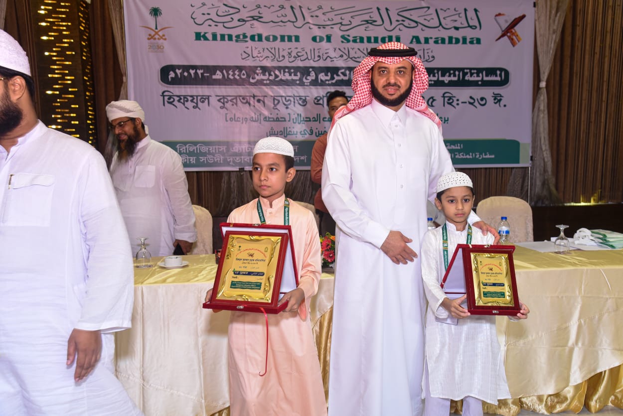 أقامت وزارة الشؤون الإسلامية والدعوة والإرشاد، ممثلة بالملحقية الدينية بسفاره خادم الحرمين الشريفين في بنغلاديش، الحفل الختامي لمسابقة حفظ القرآن الكريم التي شملت سبعة أقاليم، وشارك فيها 70 طالباً، بحضور سفير خادم الحرمين الشريفين لدى بنغلاديش الأستاذ عيسى بن يوسف الدحيلان.