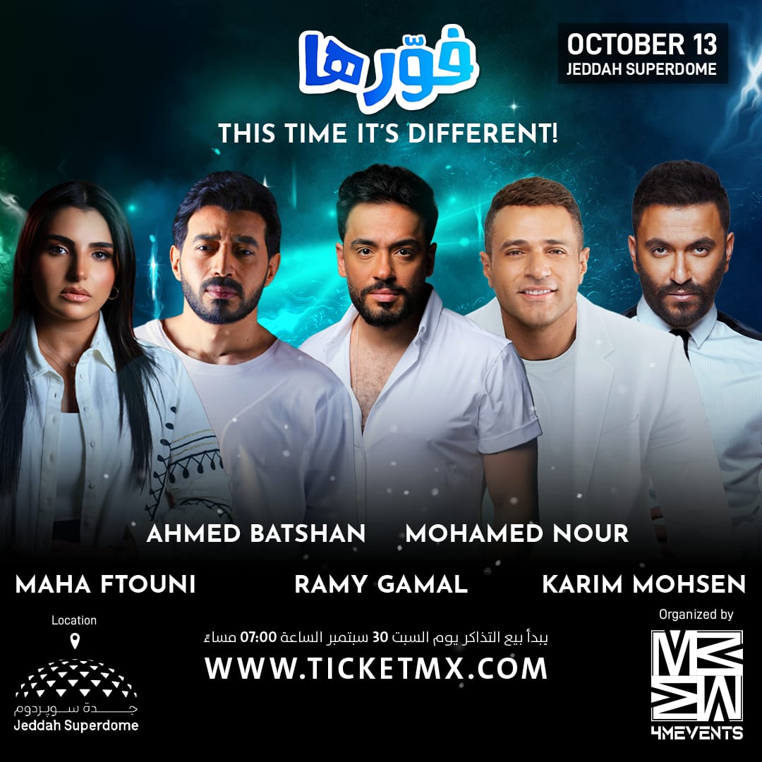 تعاود حفلات ( فورها) انطلاقتها، بحفل غنائي استثنائي يحييه عدد من الفنانين الشباب والذي أعلنت عنه 4MEvents بعنوان (فورها) ويحتضنها مسرح جدة سوبردوم يوم 13 أكتوبر 2023.