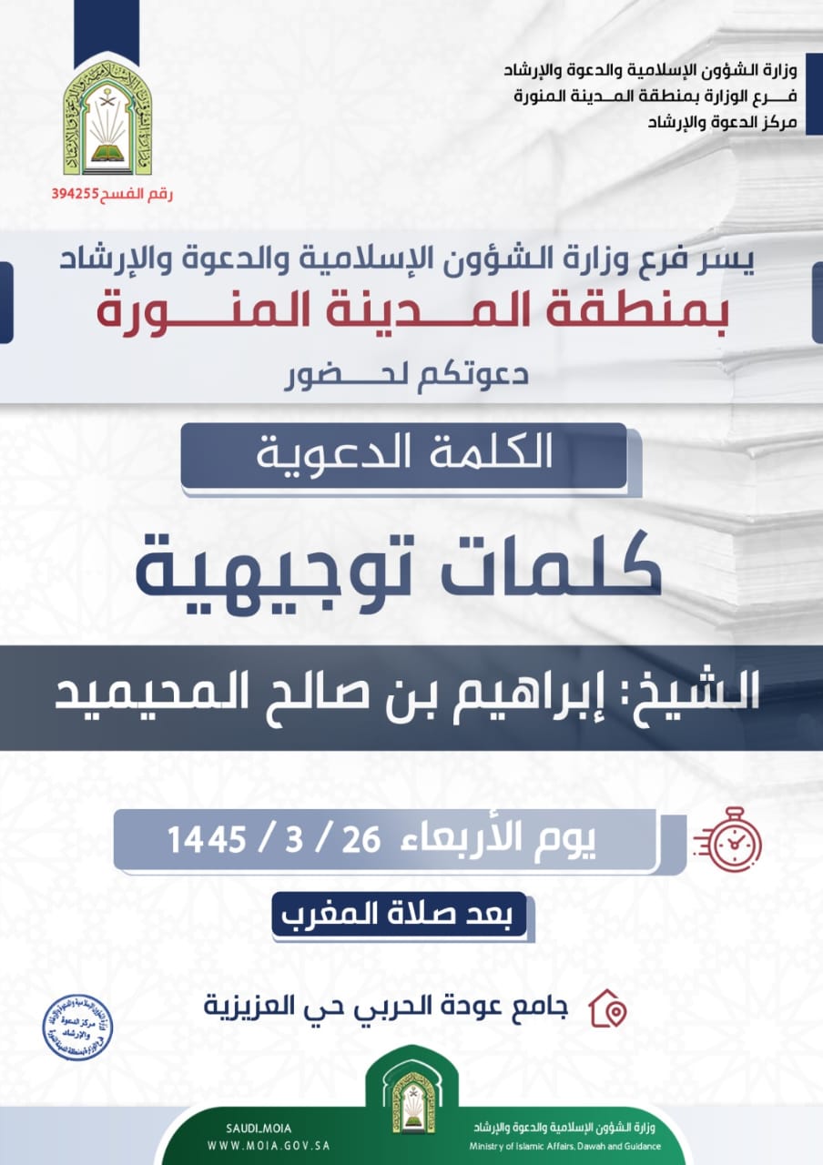 وتأتي هذه الكلمات ضمن البرامج والأنشطة الدعوية التي تنفذها الوزارة في مختلف مناطق المملكة؛ لتوعية الناس وتبصيرهم بأمور دينهم ودنياهم، وحث أفراد المجتمع على طلب العلم النافع.