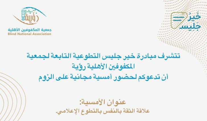 تتشرف مبادرة خير جليس التطوعية، التابعة لجمعية المكفوفين الأهلية رؤية ، أن تدعوكم لحضور الأمسية المجانية عبر منصة زووم،  بعنوان (الثقة بالنفس وعلاقتها بالتطوع الإعلامي) ، والتي تقدمها المدربة: الأستاذة . فوزية الوثلان ،وذلك يوم السبت الموافق: ١٤ أكتوبر. من الساعة: ٧:٠٠ م وحتى الساعة: ٩:٠٠ م.