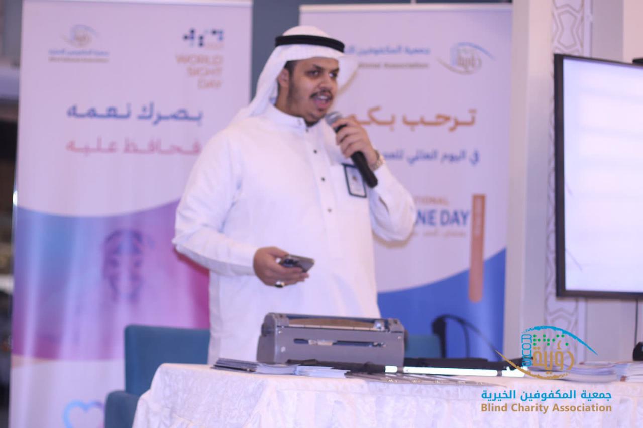 بدأ بعرض فيديو تعريفي عن العصا البيضاء، وعرَّف الحضور بنفسه، ثم بيَّن لهم أهمية هذا اليوم بالنسبة للمعاقين، وأن العالم أجمع يحتفي به.