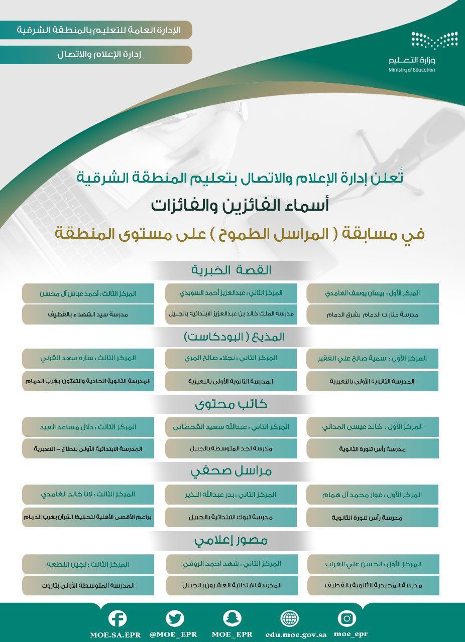 تعليم الشرقية يعلن المراكز الثلاث الفائزين والفائزات في مسابقة “المراسل الطموح”