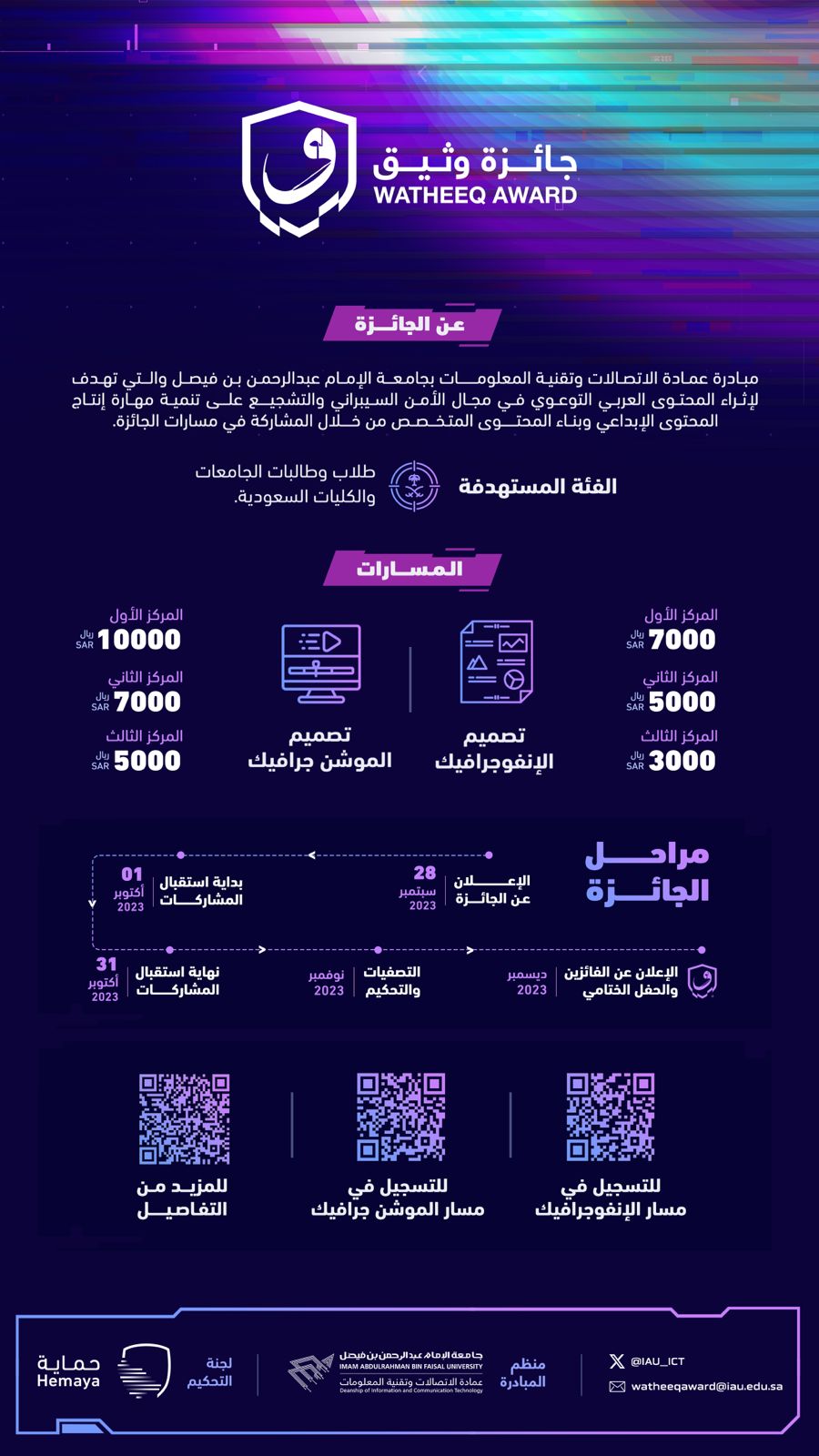 فيما ذكر عميد عمادة الاتصالات وتقنية المعلومات الدكتور خالد العيسى بأن هذه المسابقة جاءت امتداداً لنجاح مبادرة مسابقة أفضل تصميم أنفو جرافيك توعوي بالأمن السيبراني، حيث أطلقت عمادة الاتصالات وتقنية المعلومات بجامعة الإمام عبدالرحمن بن فيصل إقامة (جائزة وثيق) للتوعية بالأمن السيبراني تزامناً مع شهر أكتوبر الجاري والذي يعد (شهر التوعية بالأمن السيبراني عالمياً) وهي مسابقة على مستوى الجامعات السعودية، تهدف إلى إثراء المحتوى العربي التوعوي في مجال الأمن السيبراني، والتشجيع على تنمية مهارات إنتاج المحتوى الإبداعي وبناء المحتوى المتخصص وتهدف المسابقة التي تقام على مستوى الجامعات والكليات السعودية، إلى إثراء المحتوى العربي التوعوي في مجال الأمن السيبراني، والتشجيع على تنمية مهارات إنتاج المحتوى الإبداعي وبناء المحتوى المتخصص ، تستهدف جميع طلاب وطالبات الجامعات السعودية، كما تحتوي المسابقة على مسارين أساسيين الانفوجرافيك و الموشن جرافيك، ولجنة التحكيم تم إسنادها إلى جمعية حماية، وهي جمعية متخصصة غير ربحية تهدف لخدمة المجتمع العام والمختص في مجال أمن المعلومات .