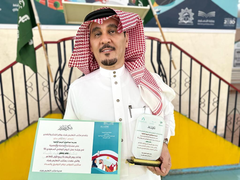 كرم سعادة مساعد الشئون التعليمية بمكتب التعليم بقباء الدكتور عادل سعيد الصاعدي ، المعلم خالد عباس برباري المعلم بثانوية عبدالعزيز ؛ نظيرًا لمشاركته الفعالة بورشة عمل ومعرض اليوم الوطني٩٣ ( نحلم ونحقق ) ، ولما بذله من جهود مميزة بهذه المناسبة مقدماً له كل الشكر والثناء والتقدير.