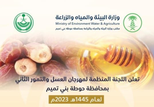 أعلن مكتب وزارة البيئة والمياه والزراعة بمحافظة حوطة بني تميم عن استقبال المشاركين في البوثات الخاصة من أصحاب العسل والتمور في بدء مهرجان العسل والتمور ، في نسخته الثانيه ٦ جمادى الأولى ١٤٤٥هـ ، لمدة خمسة أيام.