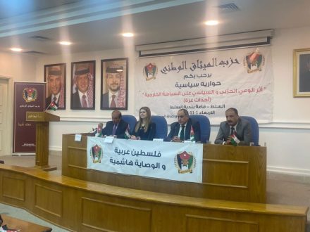 نظم حزب الميثاق الوطني امس “حواريه سياسية في مدينة السلط حول اثر الوعي الحزبي و السياسي على السياسة الخارجيه بحضور عدد من منتسبي الاحزاب وطلاب الجامعات و عدد من نواب محافظة البلقاء منتسبي الحزب وعدد من ذوي الإعاقة وأعضاء من المكتب السياسي و المجلس المركزي و المجلس الاستشاري والتي جرت بقاعة بلدية السلط الكبرى .