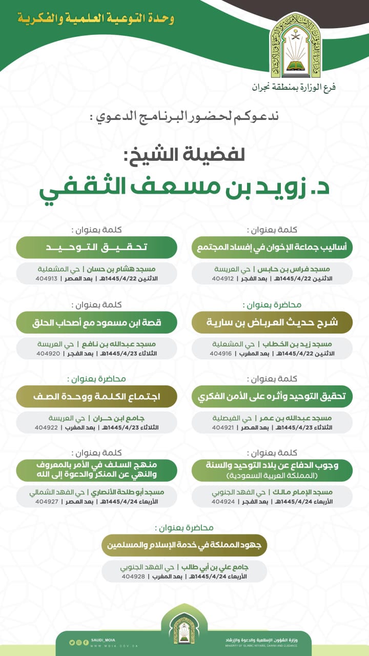 ينظم فرع وزارة الشؤون الإسلامية و الدعوة والإرشاد في منطقة نجران، ممثلا بوحدة التوعية العلمية والفكرية، برنامج فكري يستمر لمدة ثلاثة أيام، يقدمه الدكتور زويد بن مسعف الثقفي، في عدد من جوامع ومساجد المنطقة.. حيث ينطلق البرنامج اليوم، بكلمة عن “أساليب جماعة الإخوان في إفساد المجتمع” في مسجد فراس بن حابس بعد صلاة الفجر، وكلمة بعنوان: “تحقيق التوحيد” في مسجد هشام بن حسان بالمشعلية بعد العصر، ومحاضرة بعنوان: “شرح حديث العرباض بن سارية” بمسجد زيد بن الخطاب بعد المغرب.
