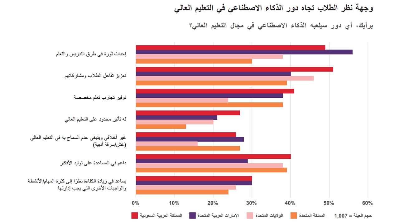 وفي الإجابة عن سؤال تناول الدور الذي سيؤديه الذكاء الاصطناعي في التعليم العالي، تبيّن أن السعوديون يثقون بقدراته التعاونية المحتملة إذ أشار 51 في المئة من الطلاب إلى أن الذكاء الاصطناعي يعزز تفاعل الطلاب ومشاركتهم. وذكروا أيضاً تجارب التعلم المخصصة التي يمكن أن يقدمها.
