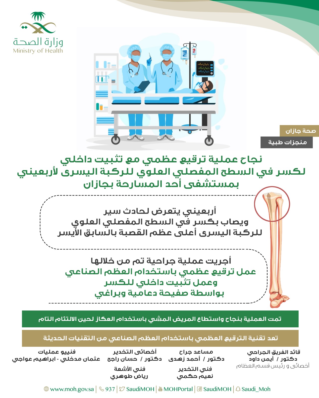 نجاح عملية ترقيع عظمي مع تثبيت داخلي لكسر في السطح المفصلي العلوي للركبة اليسرى لأربعيني بجازان
