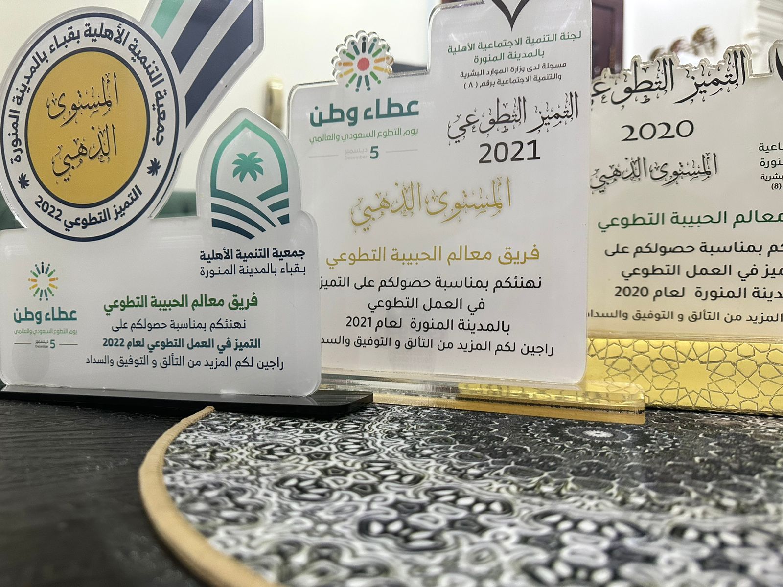 فريق معالم الحبيبة التطوعي المسجل بجمعية التنمية الأهلية بقباء المدينة المنورة، الذي يعد ضمن الفرق العديدة، والتي تتنوع أهدافها فيما يخدم العمل التطوعي في طيبة الطيبة ، الفريق متخصص في التاريخ والآثار والندوات التاريخية، و يتضمن قسم للفعاليات والمبادرات التطوعية ، حصل الفريق على المستوى الذهبي لمدة ثلاث سنوات متتالية.