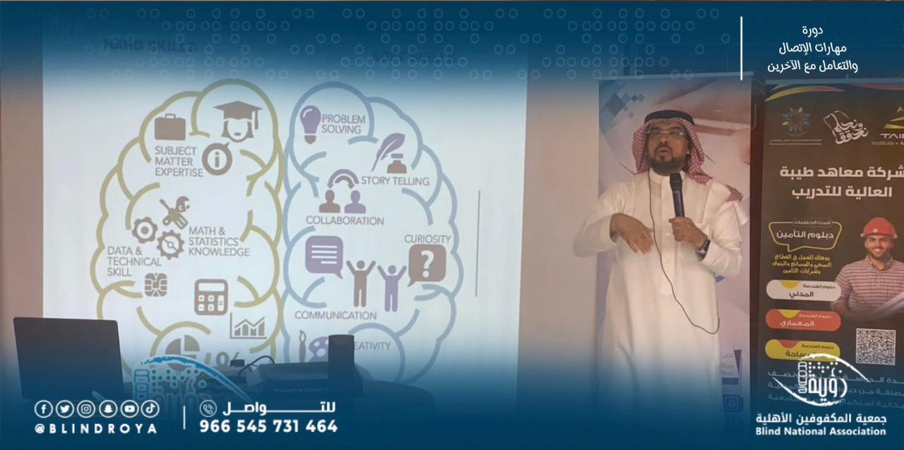 نظمت جمعية المكفوفين الأهلية رؤية بالمدينة المنورة مساء الثلاثاء ٢٣ ربيع الآخر الموافق ٧ نوڤمبر ، دورة بعنوان: مهارات الاتصال والتعامل مع الآخرين، بالتعاون مع معهد طيبة العالي للتدريب لذوي الإعاقة البصرية، وحضر الدورة عدد من الأساتذة والإعلاميين، والمهتمين بالتدريب.