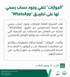 “الجوازات” تنفي وجود حساب رسمي لها على تطبيق “الواتس أب”