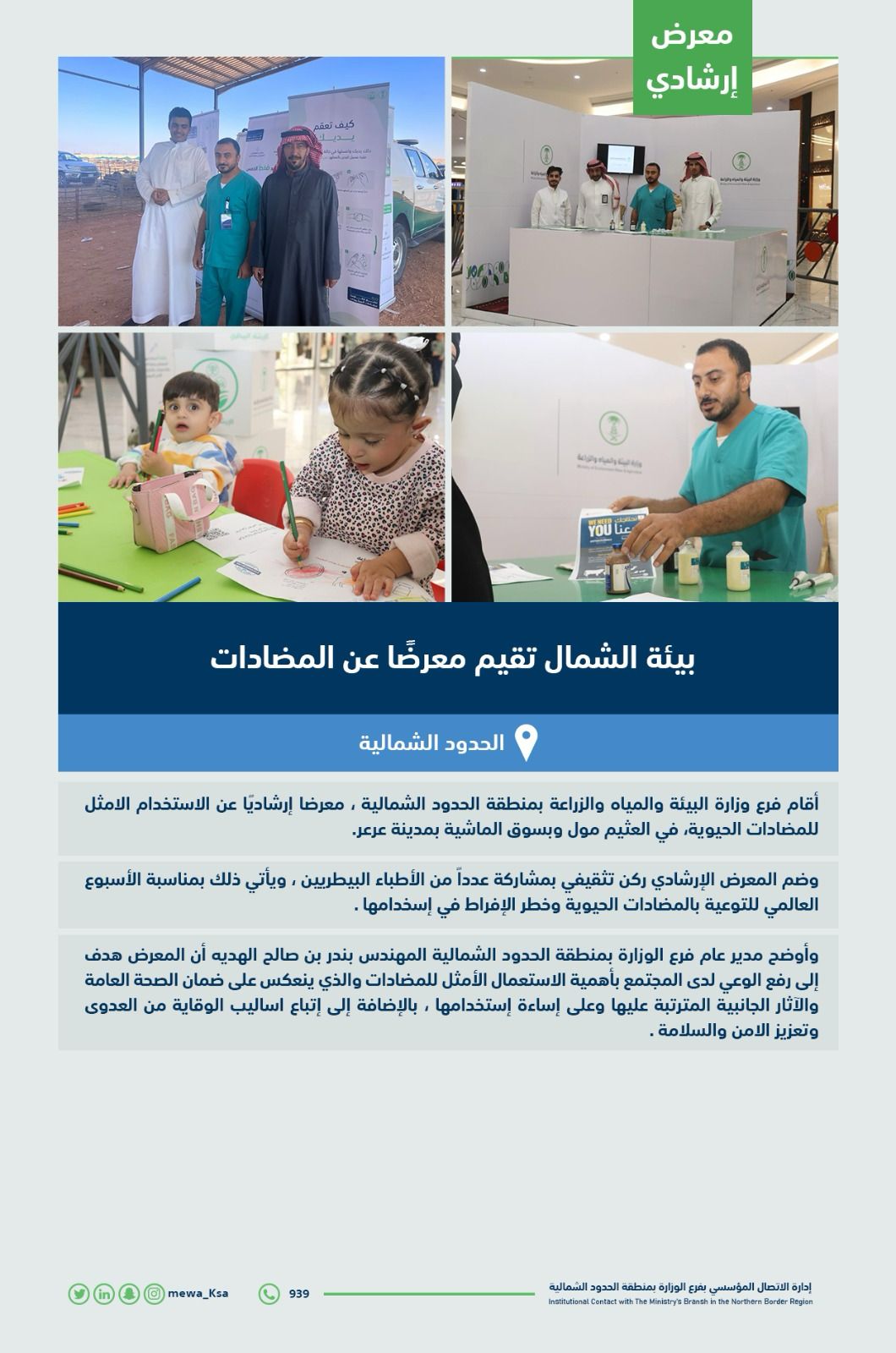 أقام فرع وزارة البيئة والمياه والزراعة بمنطقة الحدود الشمالية ، معرضا إرشاديًا عن الاستخدام الامثل للمضادات الحيوية، في العثيم مول وبسوق الماشية بمدينة عرعر.