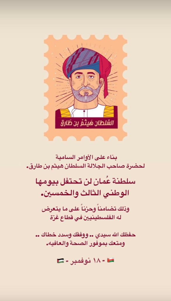 قررت سلطنة عُمان إلغاء جميع مظاهر الاحتفالات والزينة بمناسبة العيد الوطني الـ53 الذي يصادف (السبت)؛ وذلك تضامناً مع المأساة التي يعيشها السكان المدنيون في قطاع غزة. وأعلنت الأمانة العامة للاحتفالات الوطنية في سلطنة عُمان أنّ برنامج العيد الوطني الثالث والخمسين سيكون مقتصراً على العرض العسكري تحت الرعاية السامية للسُّلطان هيثم بن طارق، ورفع أعلام سلطنة عُمان؛ وذلك «تضامنًا مع الشعب الفلسطيني الشقيق».