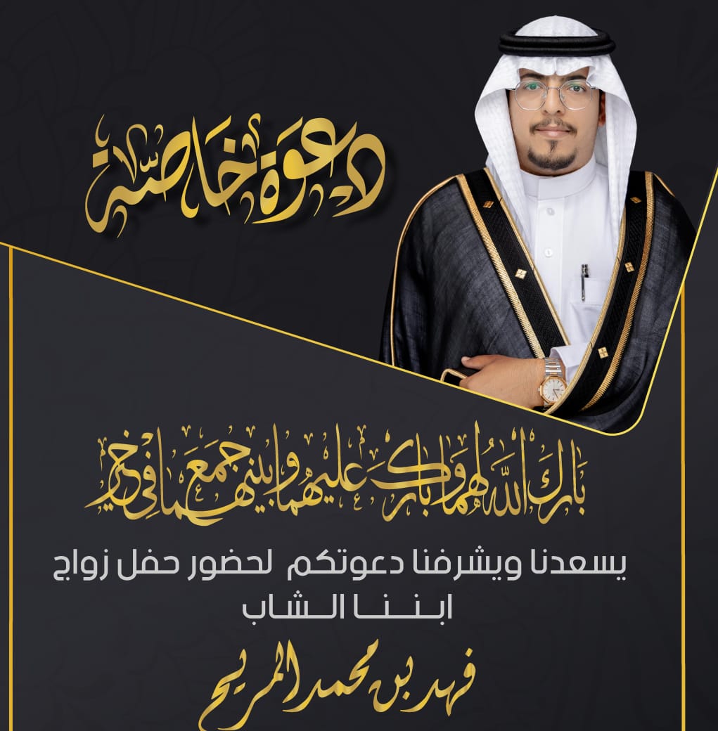 بخالص التهاني والتبريكات للشاب فهد محمد المريح ،داعيين الله أن يبارك له ، ويجعله زواجا مباركا ، ويمن عليهما بالذرية الصالحة.