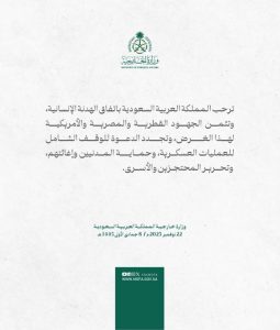 رحبت المملكة العربية السعودية باتفاق الهدنة الإنسانية، وثمنت الجهود القطرية والمصرية والأمريكية لهذا الغرض، وجددت الدعوة للوقف الشامل للعمليات العسكرية، وحماية المدنيين وإغاثتهم، وتحرير المحتجزين والأسرى.