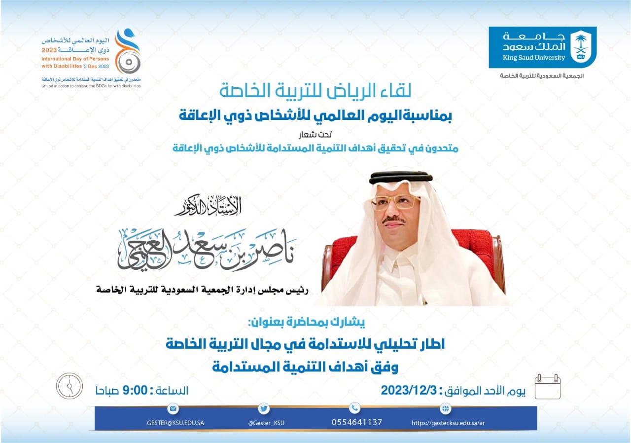 بمناسبة اليوم العالمي للأشخاص ذوي الإعاقة ، يشارك سعادة البروفيسور ناصر بن سعد العجمي رئيس الجمعية السعودية للتربية الخاصة بجامعة الملك سعود ، في لقاء الرياض للتربية الخاصة ،والذي يقام تحت شعار( تحقيق التنمية المستدامة للأشخاص ذوي الإعاقة ) ، حيث سيقوم بتقديم محاضرة بعنوان إطار تحليلي للاستدامة في مجال التربية الخاصة وفق أهداف التنمية المستدامة..