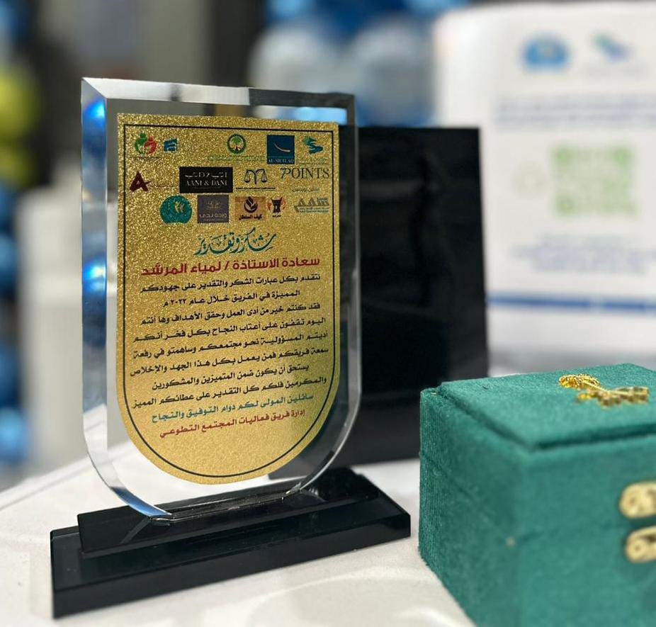 حصلت الأستاذة لمياء المرشد على درع التميز من فريق فعاليات المجتمع التطوعي؛ بفضل العطاء والاجتهاد المستمرين ،حيث تمكنت الأستاذة لمياء المرشد من تقديم الكثير والكثير في مجال العمل التطوعي.